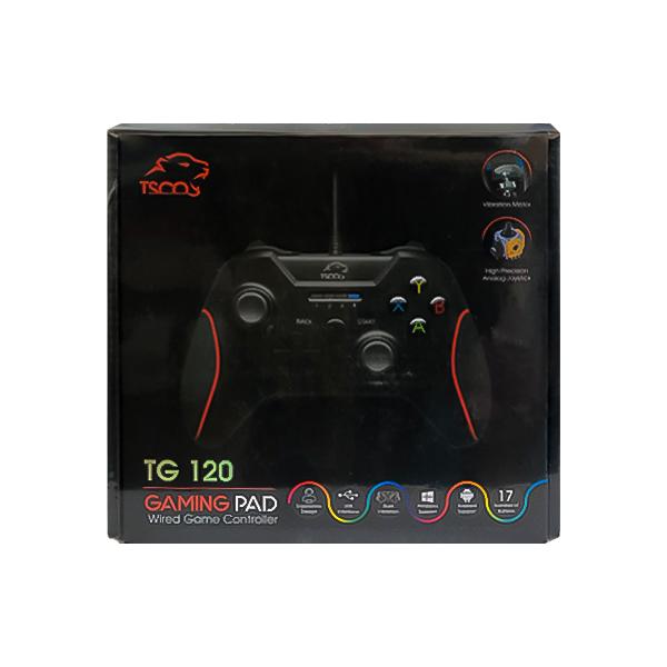 دسته بازی تسکو مدل TG 120 برای کامپیوتر، لپ تاپ و موبایل  طراحی شده است که دارای یک دسته بازی با سیم با کابلی به طول 180 سانتی متر است و با رابط USB متصل می شود. ابعاد این دسته ی بازی 160*110*65 میلی متر با وزن 30 گرم است که از 17 کلید تشکیل شده است. این دسته بازی شوک دار است که اهرم هایی روی دسته اند که جهت حرکت را بهتر و راحت تر به رایانه انتقال می دهند و در بعضی از بازی ها در شرایط خاص به لرزش در می آیند و موجب ایجاد هیجان مضاعف در هنگام بازی می شوند.