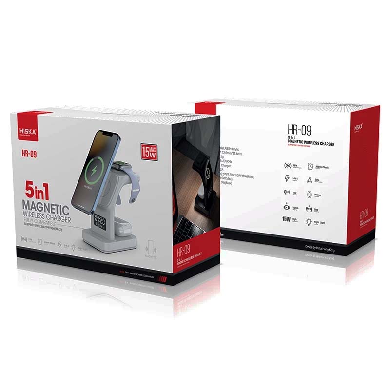 با شارژر بی سیم هیسکا مدل HR-09 یک محصول خریداری می‌کنید، اما در اصل 5 محصول مختلف دریافت می‌کنید! این محصول ویژگی شارژ گوشی موبایل شما در کنار شارژ ساعت هوشمند و هدفون بی‌سیم را ارایه می‌دهد. در این محصول همچنین یک چراغ خواب و ساعت زنگ‌دار جای گرفته که می‌توانید از آن‌ها استفاده کنید. فقط کافی است که شارژر را به‌وسیله یک کابل USB به برق متصل کنید و هم‌زمان با شارژ گوشی موبایل، ساعت هوشمند و هدفون بی‌سیم تان، چندین زنگ هشدار تنظیم کنید و از نورهای رنگی چراغ شب لذت ببرید. مسلما اولین ویژگی این محصول توانایی شارژکردن گوشی هوشمند شما است. شما می‌توانید گوشی موبایل خود را با حداکثر با برق خروجی 15 وات به‌راحتی و بی‌سیم شارژ کنید. این محصول قابلیت شارژ گوشی به‌ صورت عمودی وجود دارد؛ هم‌زمان گوشی خود را به‌صورت عمودی شارژ کرده و از آن استفاده کنید ودر عین‌حال از تماشای ویدیو، تماس‌های تصویری و یا بازی خود لذت ببرید. از دیگر قابلیت‌های این محصول شارژ ساعت هوشمند و هدفون بی‌سیم شما در کنار گوشی همراهتان هست. برق خروجی برای ساعت هوشمند حداکثر 2 وات و برای هدفون بی‌سیم حداکثر 5 وات است. از دیگر قابلیت‌های محصول، داشتن چراغ خواب و ساعت دیجیتال است که به وسیله دکمه هایی که پایین محصول قرار دارند میتوانید چراغ خواب را روشن و خاموش و همچنین ساعت دیجیتال را تنظیم کنید. شارژر بی‌سیم مدل HR-09 محصولی برای هماهنگی امور روزانه شماست که اطمینان خاطر برای شارژ‌شدن تمام دستگاه‌هایتان، بیدارشدن از خواب در زمان دقیق و نور شبانه ملایم را به شما هدیه می‌کند.